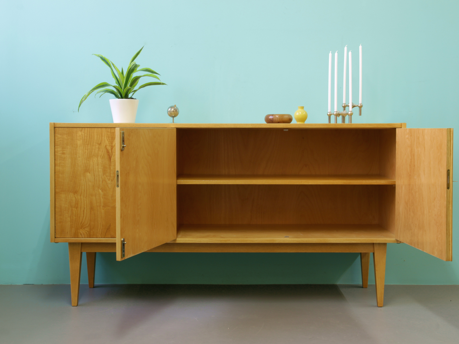 Das Sideboard wurde aufwendig fachgerecht restauriert. Dadurch strahlt das Sideboard mit neuem Glanz und die Maserung kommt wieder voll zur Geltung ohne die schöne Patina zu verlieren. Auch innen ist der Schrank super erhalten. Der schöne Schrank besitzt drei Türen, hinter diesen befinden sich Einlegeböden. Der originale Schlüssel sowie alle originalen Einlegeböden sind vorhanden. Die Schlösser des Sideboards funktionieren einwandfrei.